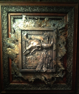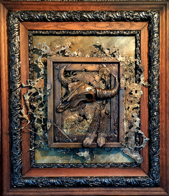 Icons of the old West, the buffalo skull is profoundly set in this richly textured piece. This very limited series of 9 are splashed, dripped and thrown using the finest Evedur bronze. This one is in a rebuilt 1880's frame.