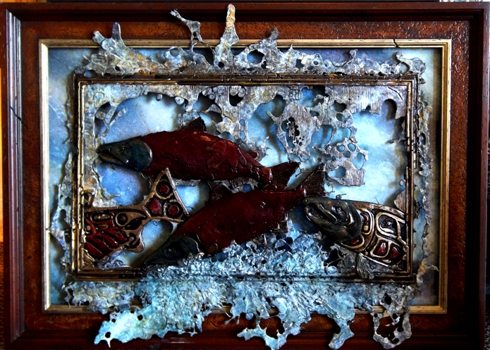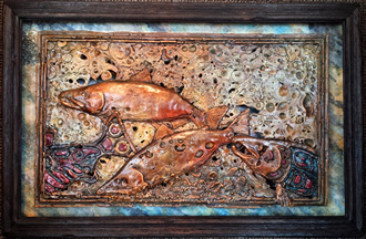 Wild Chinook Salmon are king among fish in the North West. In the piece they follow their ancestors up hundreds of miles of river to find their spawning grounds. A stone patina has been applied to this piece, however, other colors are available. Give me a call with your specific visions. This very limited series of 15 are splashed, dripped and thrown using the finest Evedur bronze.